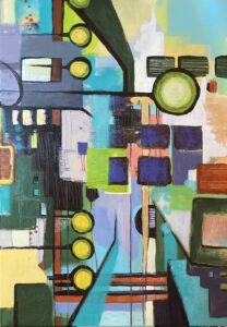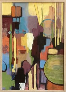 Ik schilder met acrylverf en werk met heldere kleuren. De schilderijen bouw ik op in verschillende lagen waardoor een textuur ontstaat die beweging van de elementen en diepte versterken. Zoekend naar vormen en kleuren ga ik aan de slag, en gaandeweg ontstaat een harmonie tussen de vormen.